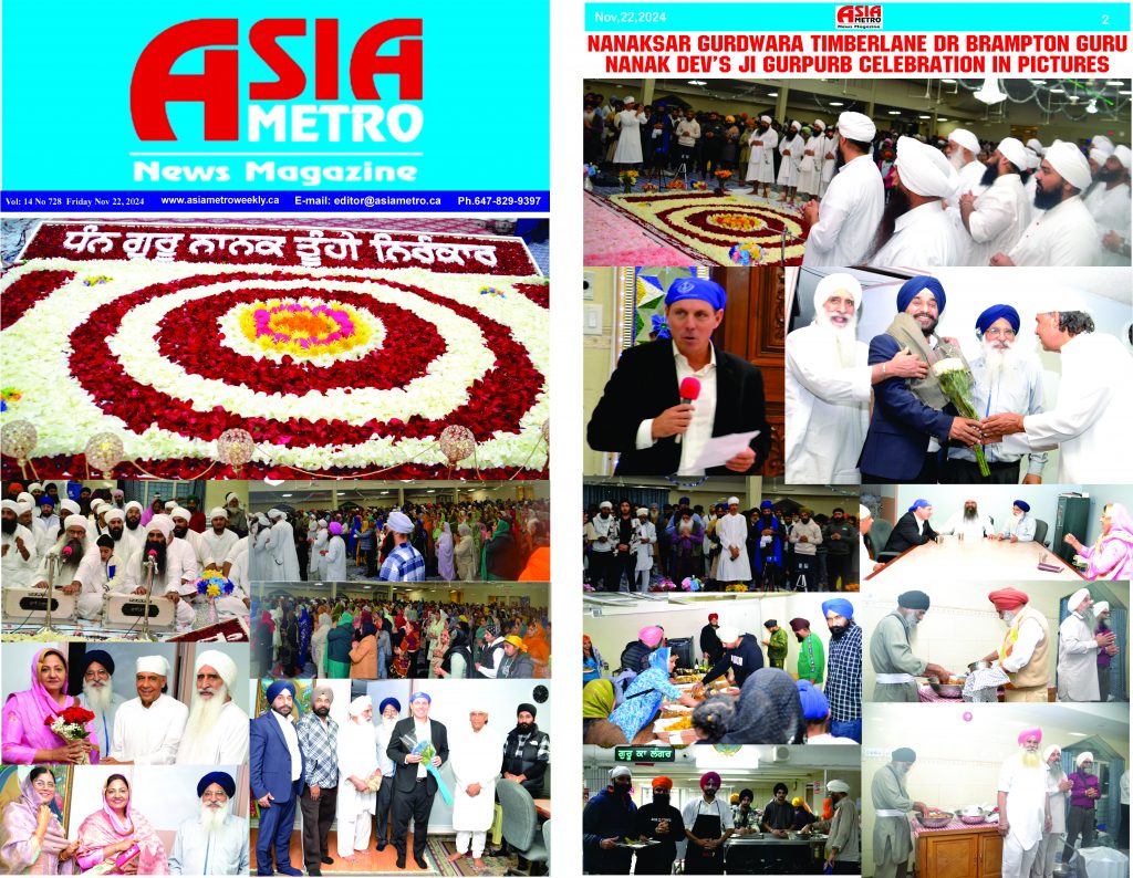 A large number of devotees paid obeisance at Nanaksar Gurdwara Brampton on the Gurpurab of Guru Nanak DevBy Surjit Singh FloraOn November 15, the Brampton Nanaksar Sikh Temple on Timberlane in Brampton celebrated the 555th birth anniversary of Guru Nanak Dev, also known as Guru Nanak Gurpurb, commemorating the birth of the first Sikh Guru. This day holds immense importance in Sikhism, as it honors the life and teachings of Guru Nanak Dev Ji while also advocating the principles of unity, equality, and selfless service that are central to Sikh philosophy. From date to history, here is everything you need to understand about this day.A significant number of devotees attended the Nanaksar Sikh Temple to pay their respects. The main hall of the Gurdwara featured elegant floral arrangements and exquisite garlands. Elegant lighting adorned the exterior wall.