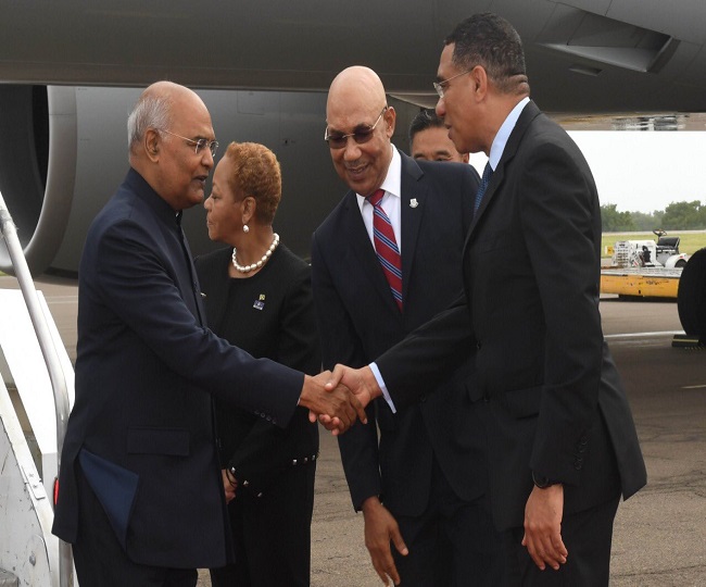 8:28 hours: President Kovind arrives in Jamaica. He was received by Jamaican Governor General Sir Patrick Allen and Prime Minister Andrew Holness at the airport.